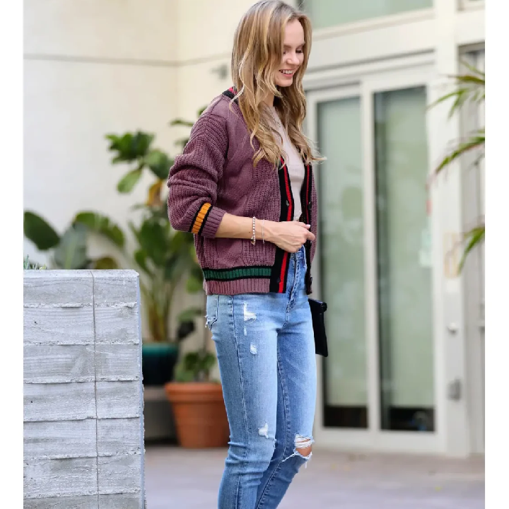 Brielle Contrast Trim Cable Knit Cardigan / EGGPLANT