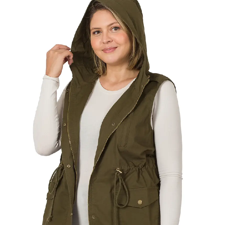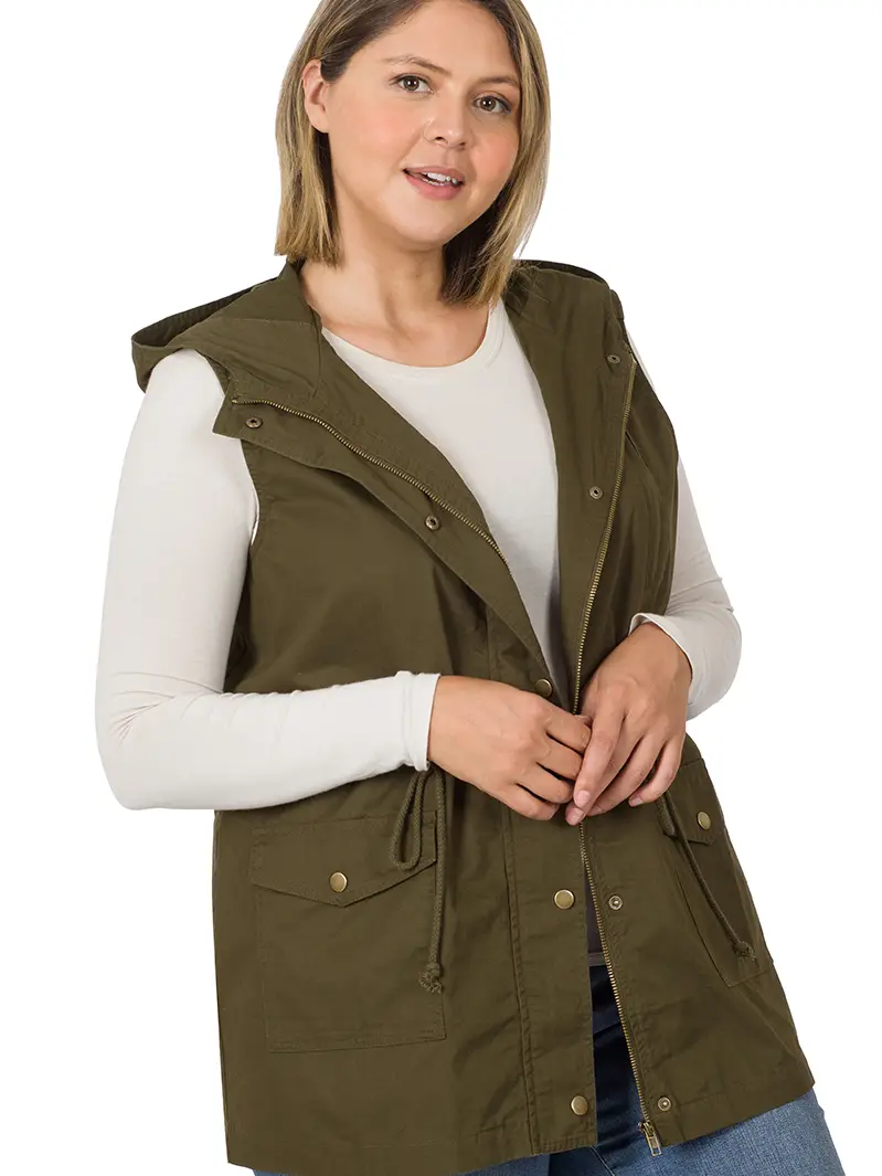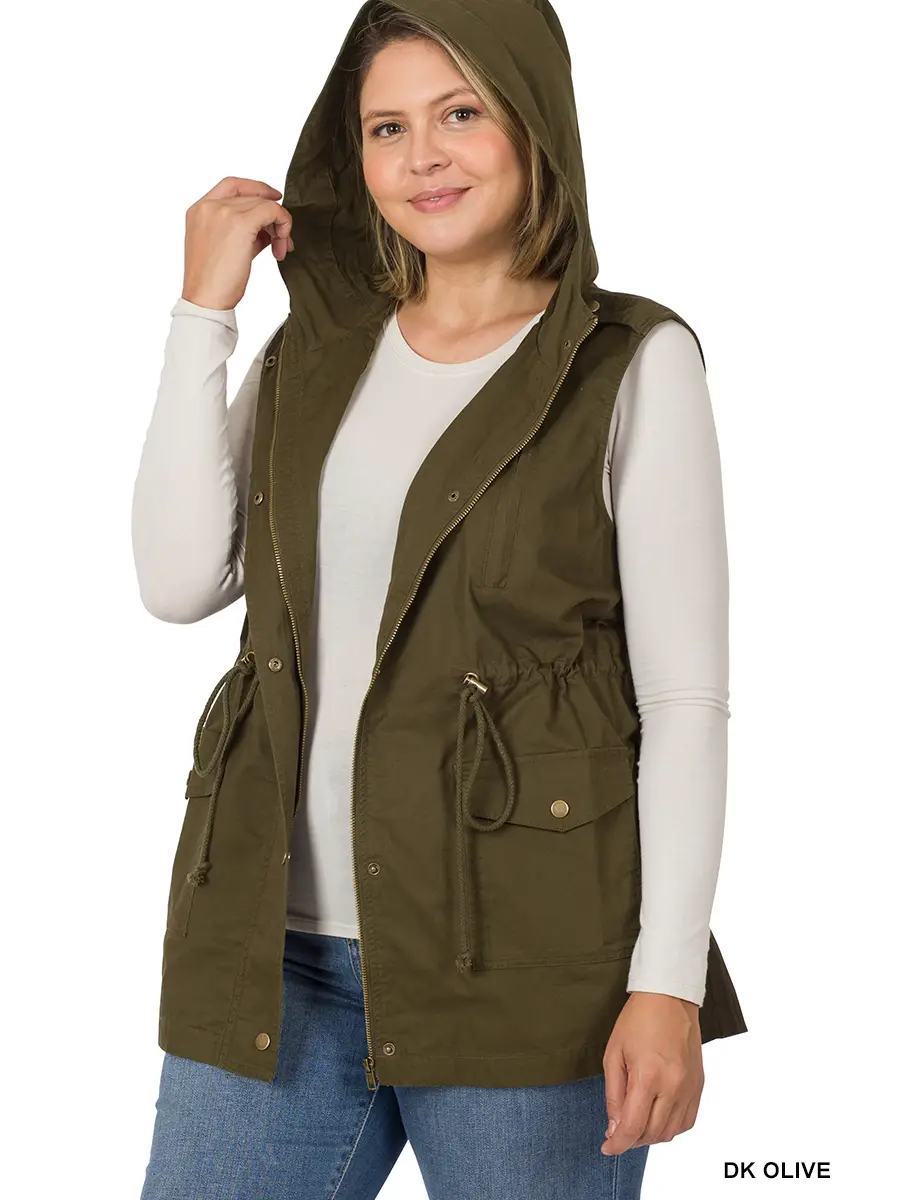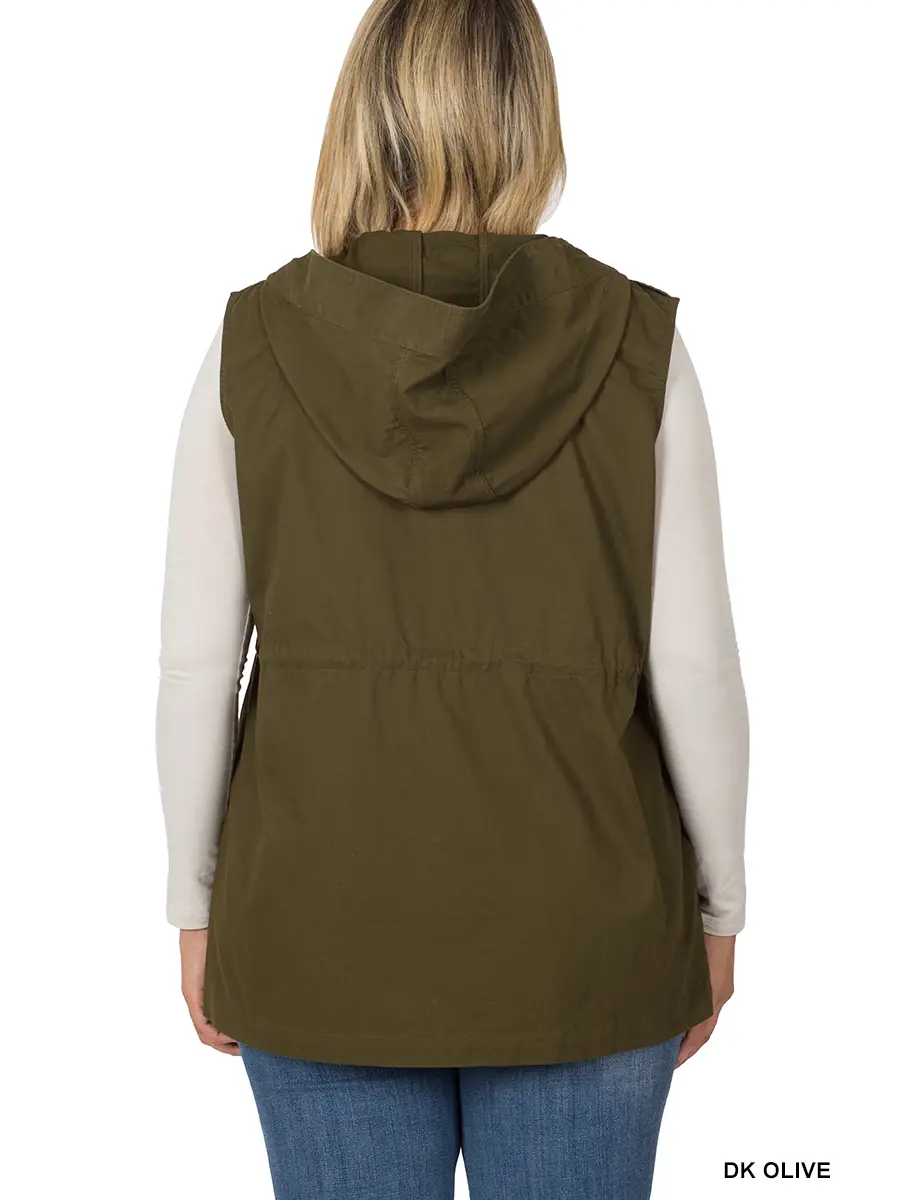 Plus Drawstring Waist Military Hoodie Vest With Pockets.